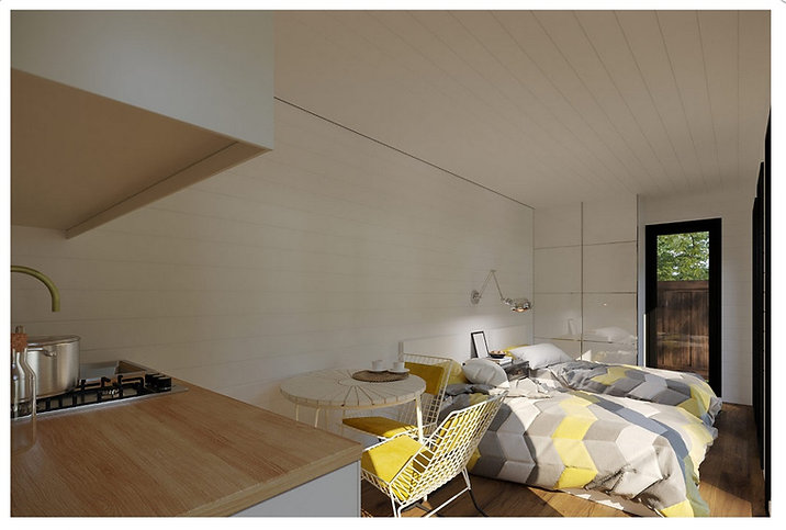 Das V4-Containerstudio ist ein eingebautes und isoliertes innenliegendes Tiny House oder Hausanbau, das steckerfertig geliefert wird.